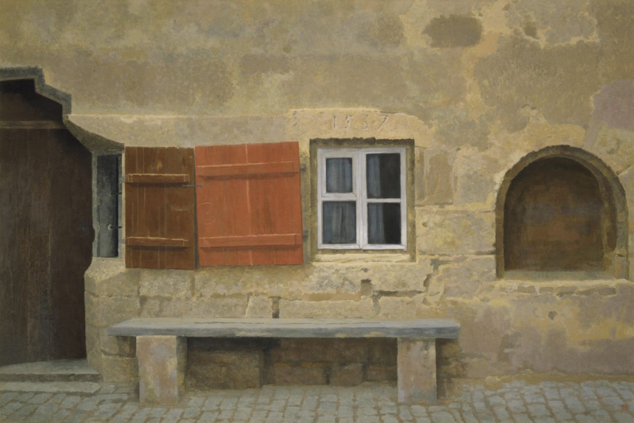 《窓明り》に描かれたドイツのリューベックはトーマス・マンの自伝的小説『トニオ・クレーゲル』の舞台だ。マンの故郷でもある港町を、魁夷は神戸への郷愁を重ねつつ訪れた。青い夕闇に沈む古く重厚な家々の中で窓がひときわ明るい黄色に灯る。《窓》は、壁に刻まれた「1537」という年記に時の流れを、半ば開いたカーテンの奥に人の暮らしを感じる作品であり、素朴な窓辺が人の営みを普遍的に象徴する風景として表現されている。