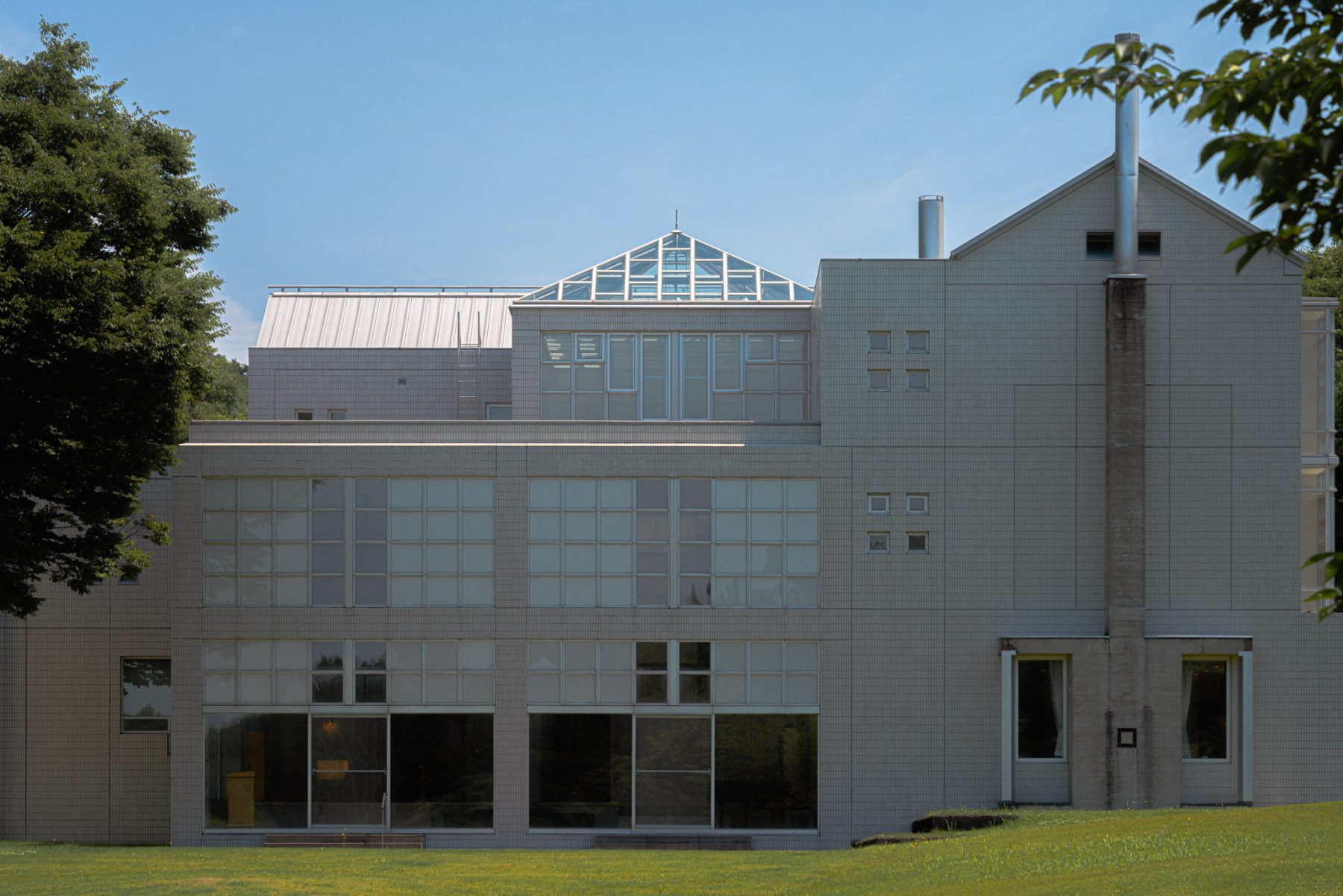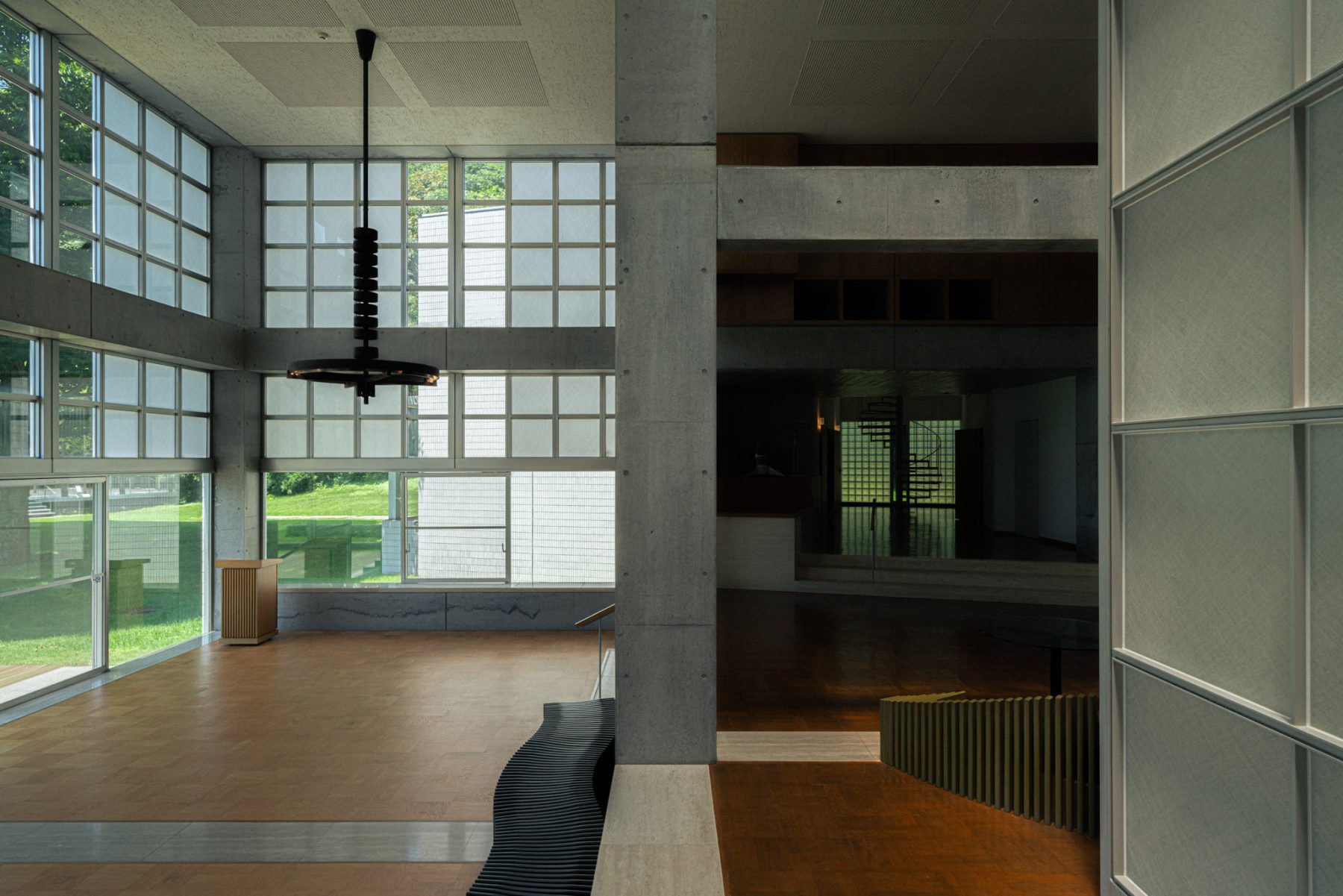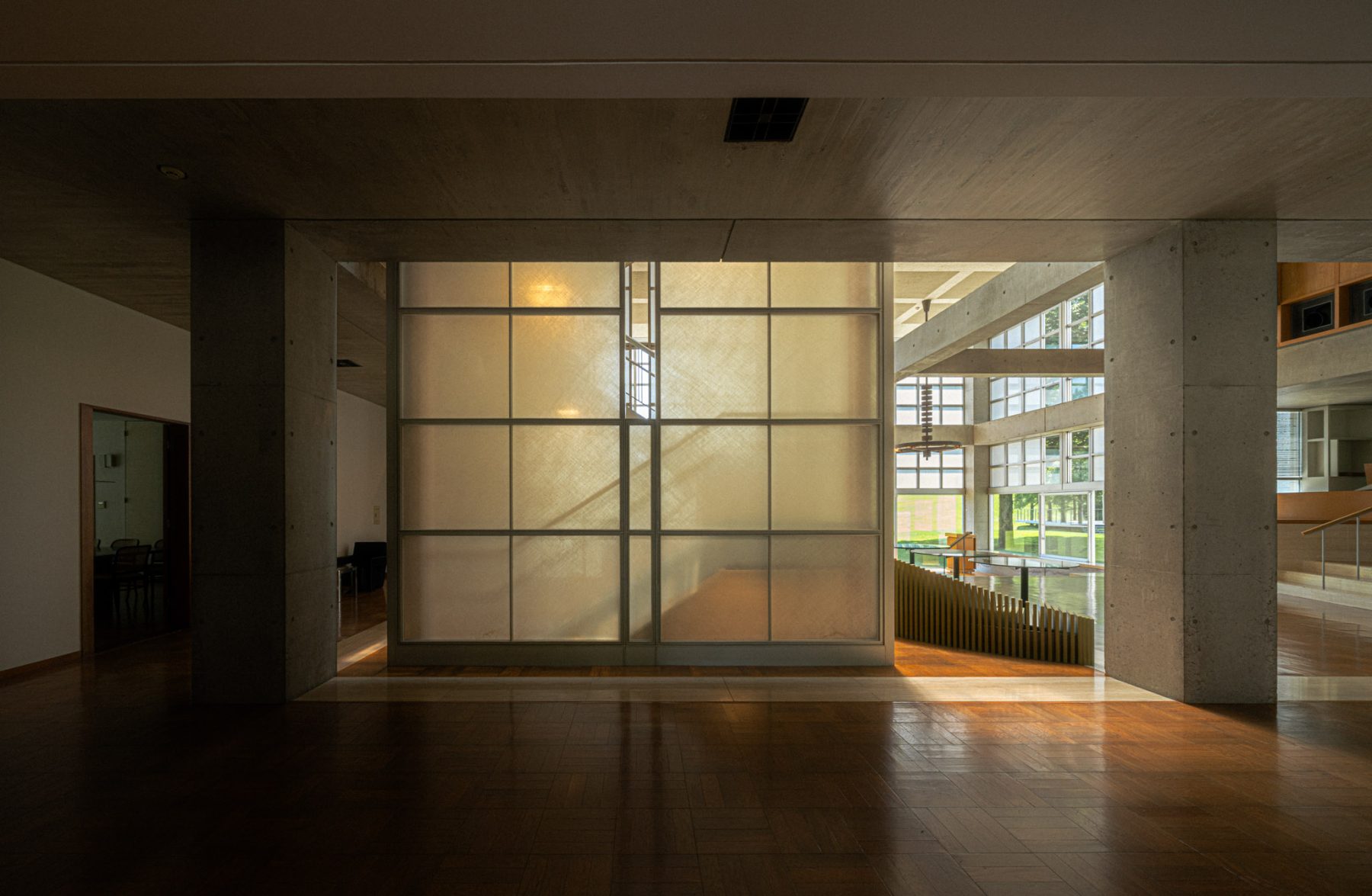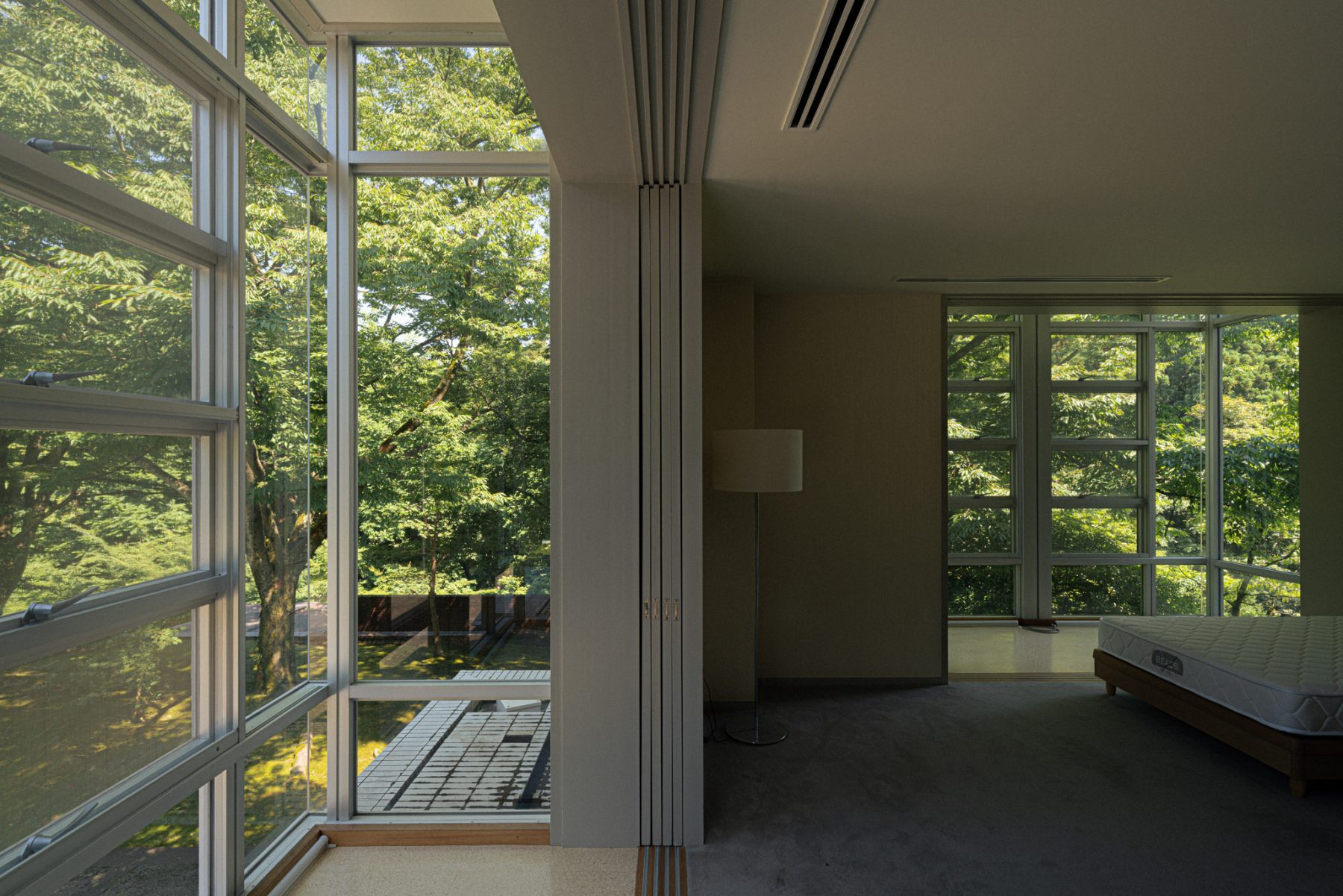「凸と+」が造形のモチーフに使用された企業の研修宿泊施設。正面外観は切妻の妻面と宿泊室にとりついた出窓が垂直性を強調する。宿泊室の出窓は家族室を除いて、個室4つで壁、床を隔てて共有されている。障子戸、板戸の2枚の引き込み戸により、明るさと開放の度合いをコントロールする。出窓側は室内側に比べて500mmほど高さ方向への広がりがある。ホールの大開口の上部にはガラス繊維シート入りのガラスを用いて障子風の意匠を実現し、透明のガラスとの対比で凸型が浮き上がる。一方でセミナー室の窓は同じく凸型だが、壁面に対して窓がセットバックし庭との中間領域となっている。室内の天井面よりも高い位置から光が落ちてくるため、トップライトのような効果を生み出している。