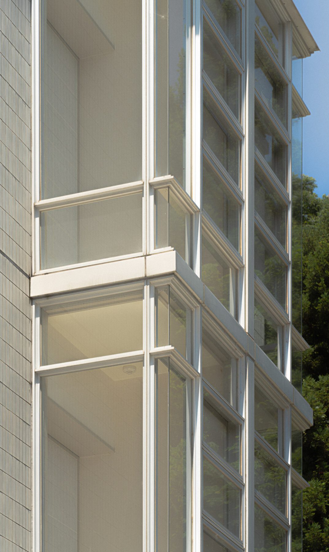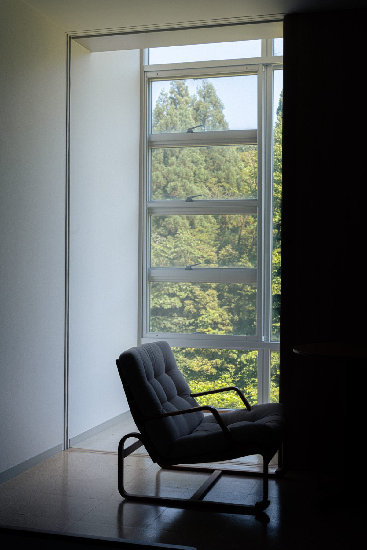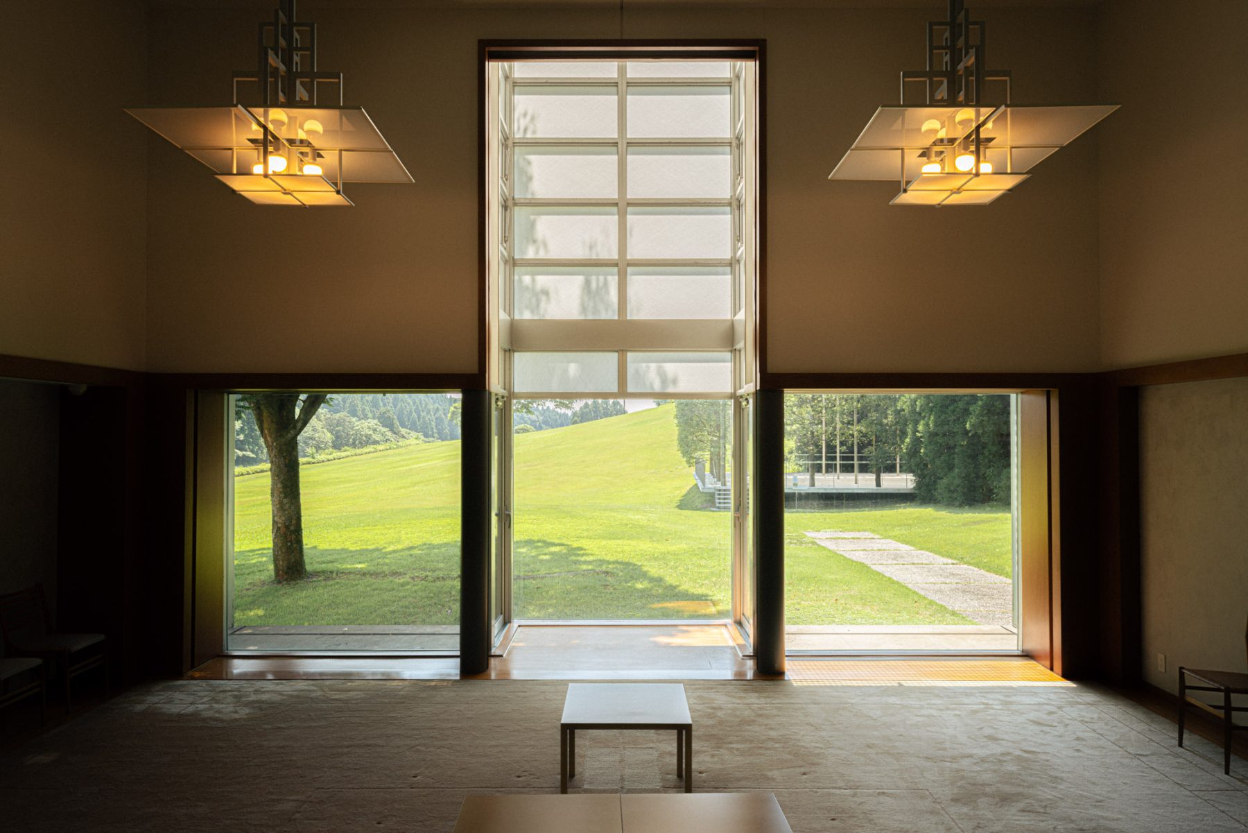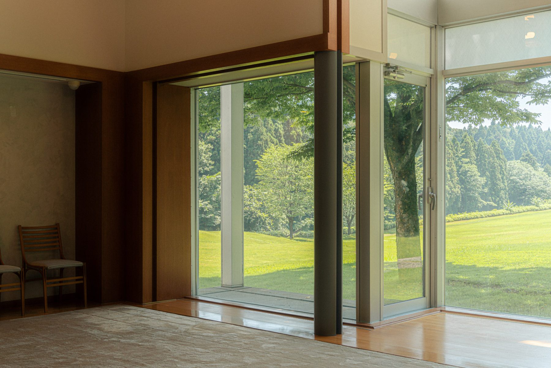 「凸と+」が造形のモチーフに使用された企業の研修宿泊施設。正面外観は切妻の妻面と宿泊室にとりついた出窓が垂直性を強調する。宿泊室の出窓は家族室を除いて、個室4つで壁、床を隔てて共有されている。障子戸、板戸の2枚の引き込み戸により、明るさと開放の度合いをコントロールする。出窓側は室内側に比べて500mmほど高さ方向への広がりがある。ホールの大開口の上部にはガラス繊維シート入りのガラスを用いて障子風の意匠を実現し、透明のガラスとの対比で凸型が浮き上がる。一方でセミナー室の窓は同じく凸型だが、壁面に対して窓がセットバックし庭との中間領域となっている。室内の天井面よりも高い位置から光が落ちてくるため、トップライトのような効果を生み出している。