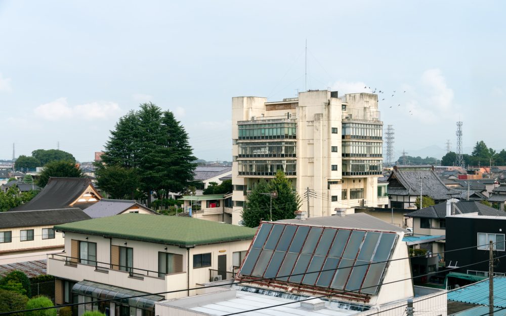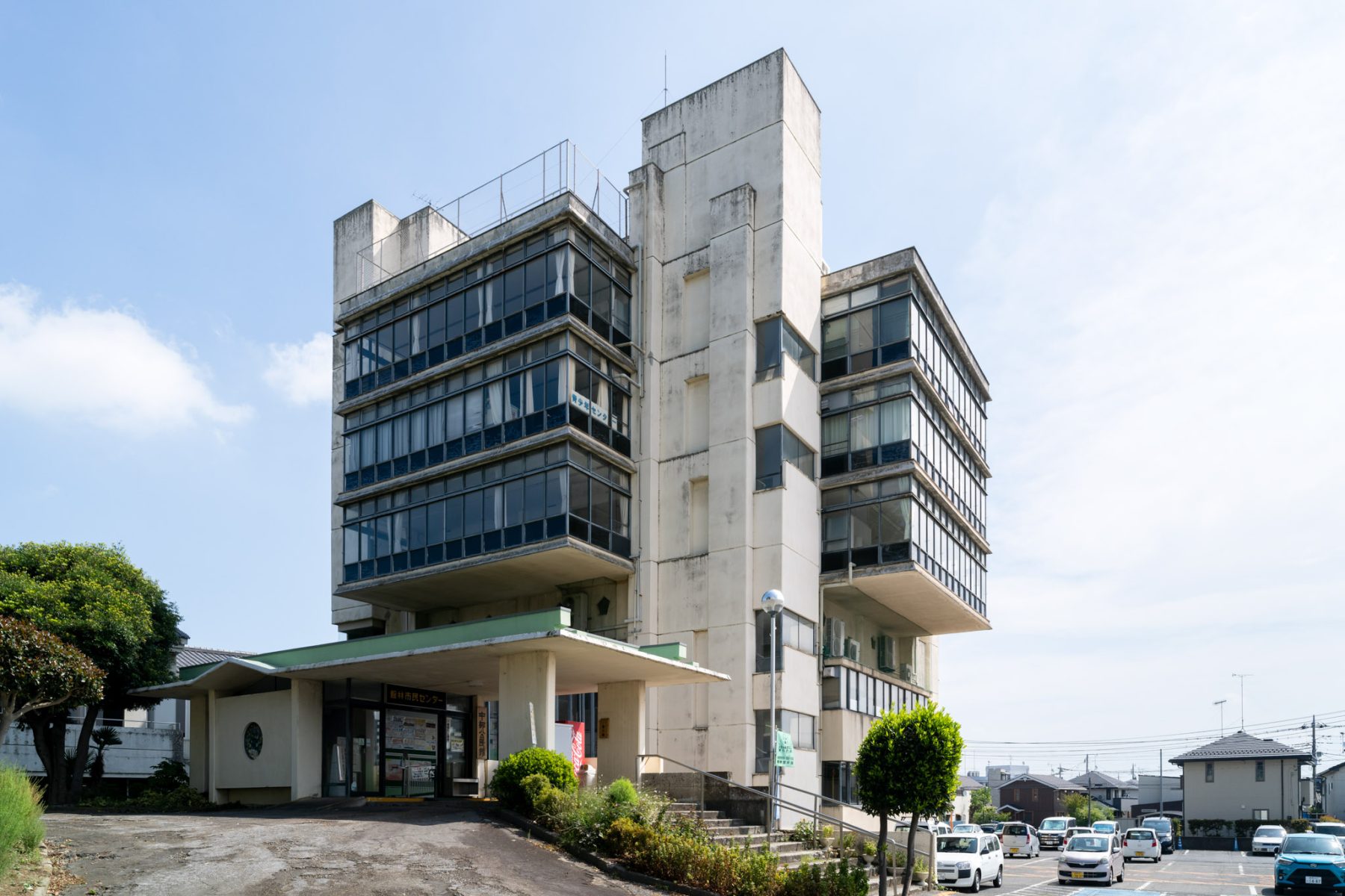 菊竹清訓の著作『代謝建築論』で語られた理論「か・かた・かたち」の実践例としても有名なこの建物は、1981年まで市庁舎として、現在は市民センターとして利用されている。階段・エレベーター、トイレ等が入った四隅の巨大なコアに対して、上階3層分を4m分キャンチレバーで4方向に張り出さしている。張り出した部分は上下に換気用の突き出し窓が付いた全面ガラス張りの部屋となり、周囲を見はらす180度の視界を実現している。正面玄関東側にある渡り廊下の南面した縦格子窓は、あみだ形に横桟、方立が入る。さらにガラス面を前後に120mmずつランダムにずらすことによって平滑な立面を避け、陰影とリズムを生み出す。中3階の書庫にある五角形の窓は、上部左右にある2つの頂点が軸となる横軸回転窓で、城郭の鉄炮狭間のような意匠は直線的な外観に対してのアクセントとなっている。