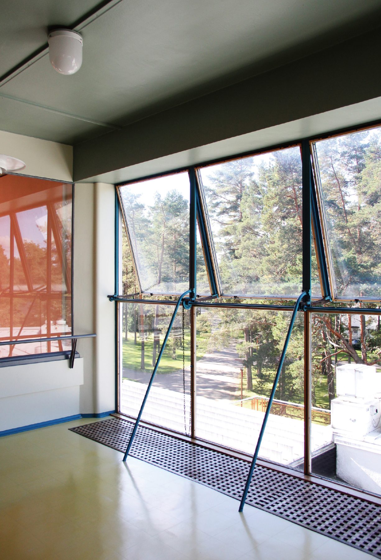 食堂吹き抜けの中2階にある読書室の窓。華奢な鉄製窓枠の上段は突き出し窓であり、枠の交差部にチェーンを引き歯車を回転させることで2枚同時に開閉する機構が設けられている。開けた窓の重量が枠中央に与える外力に抵抗しバットレスで補強されている。この窓の機構は近郊のトゥルクの造船所でつくられた。グレーチングの下にはラジエーターが設けられている。