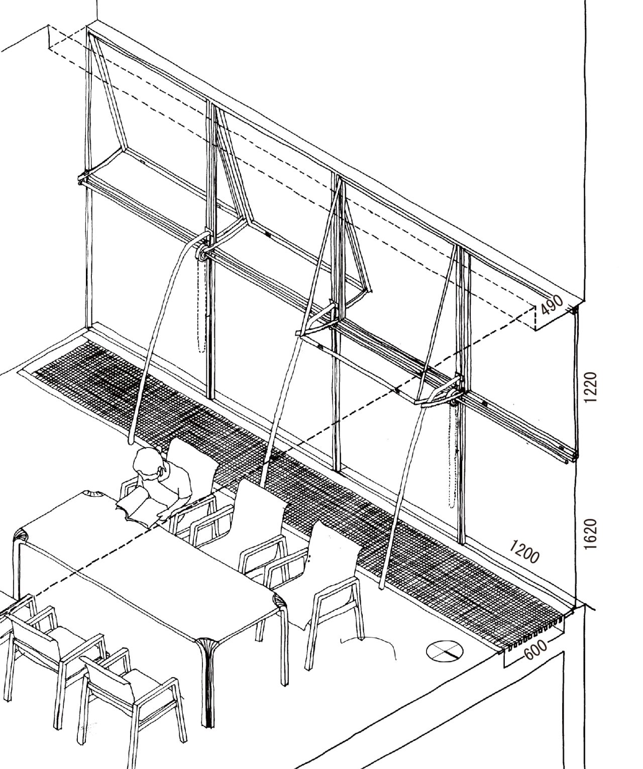 食堂吹き抜けの中2階にある読書室の窓。華奢な鉄製窓枠の上段は突き出し窓であり、枠の交差部にチェーンを引き歯車を回転させることで2枚同時に開閉する機構が設けられている。開けた窓の重量が枠中央に与える外力に抵抗しバットレスで補強されている。この窓の機構は近郊のトゥルクの造船所でつくられた。グレーチングの下にはラジエーターが設けられている。