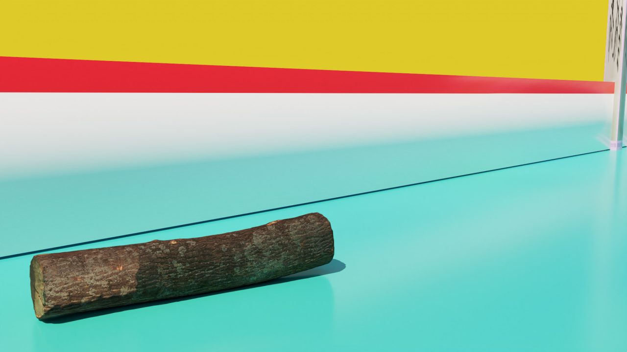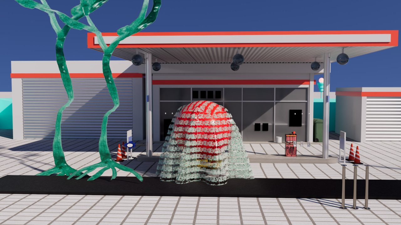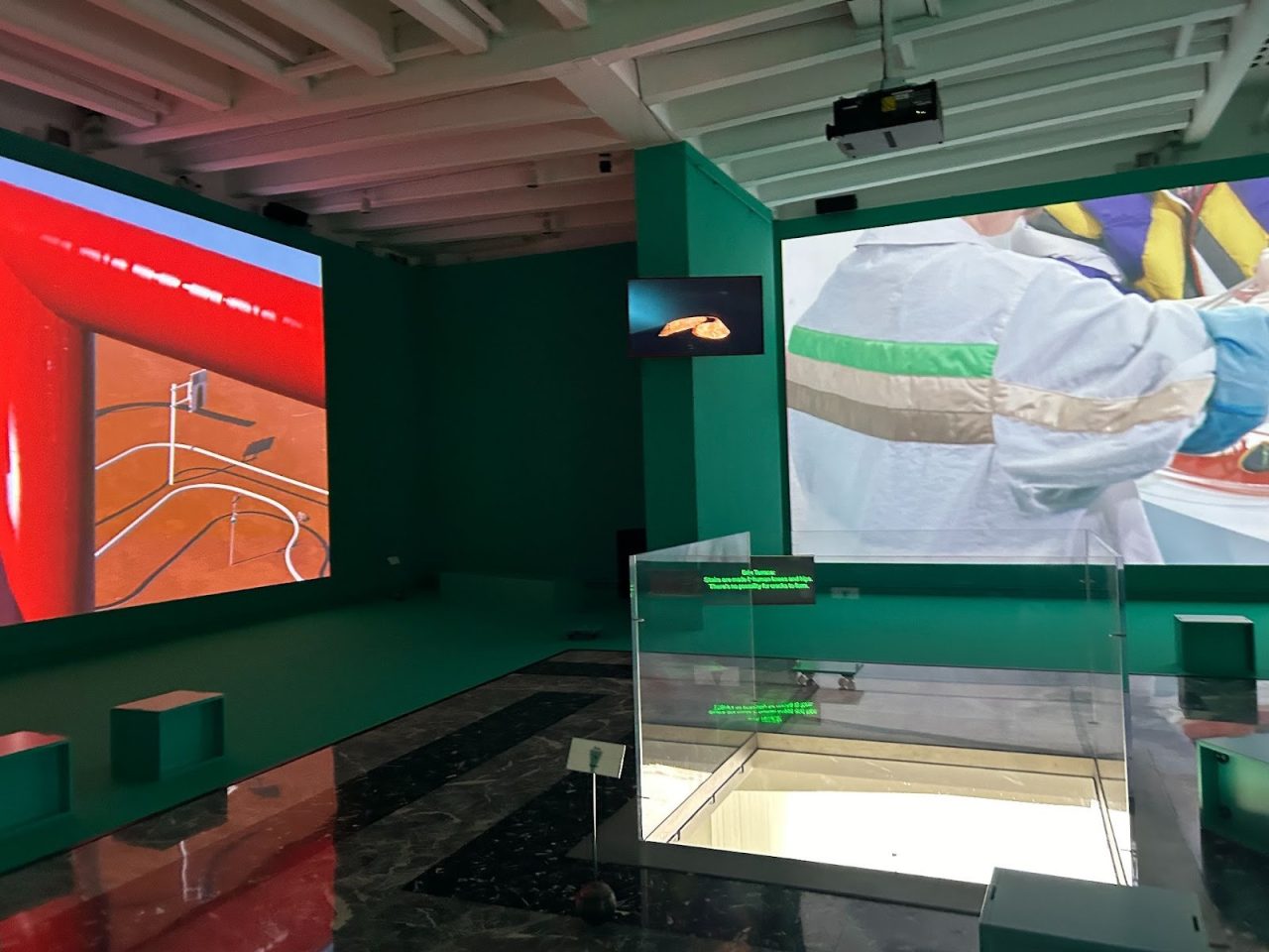 日本館の展示室の床は大理石でできている。しばしば人間は大理石をピカピカに磨いて使うが、これは本来、外気に晒してはいけないものではないか、とぞっとする。掘り起こしてはいけないものを掘り起こし、巨大生物の剥き出しの内臓を装飾として、美的なものを含む判断のもとに採用し、長い時間、建築の表面として固定し、見ている。と、私の身体とこの身に宿る主観性はそう感じるのだ。そんな大理石だが、ここでは向こうの映像の光を反射させ、絶え間なく移り変わる薄まった色を間接的に伝えている。大理石に開いた穴を覗くと、通り過ぎる人や、ベンチのまわりで立ち止まる人などが見える。自然光に満ちた外の空間はこちらから見るとやや唐突で、演劇が上演されているようだ。モニターに映る黄緑色の文字(スクリプト)は、暗い道沿いに煌々と輝く物流拠点を見つけたときの、車の前方窓ガラスににじむ光に抱く安らかな気持ちを想起させる。隣接するファストフード店の赤と黄色のLED光と混ざり合いながら、国道沿いのガソリンスタンドが「いつまでもやってるよ」と優しく語りかける。