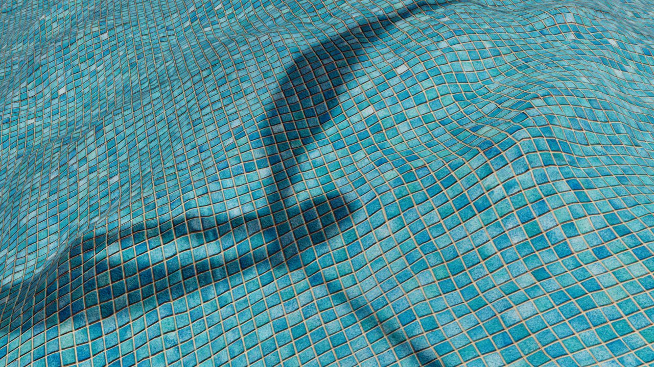 関係のある出来事:波の間に杭が立っている。「あれが『何かの道具』だったんだね」と言われた。確かに似ているから、あれが先に来たのかもしれないが、わからない。ついでに床が波打つことにして、タイルも丁度青いので、「あ、ここは海だったんだね」と言われても、「そうです」と言える。波が切断される場所に立っている。目の前の水面が揺れている。石畳の上にいる。3DCG空間の座標系の中にもいる。石畳は波のように揺れることもできる。