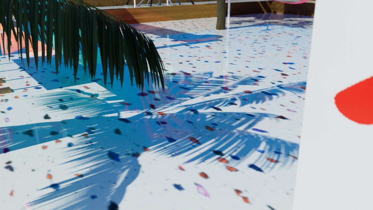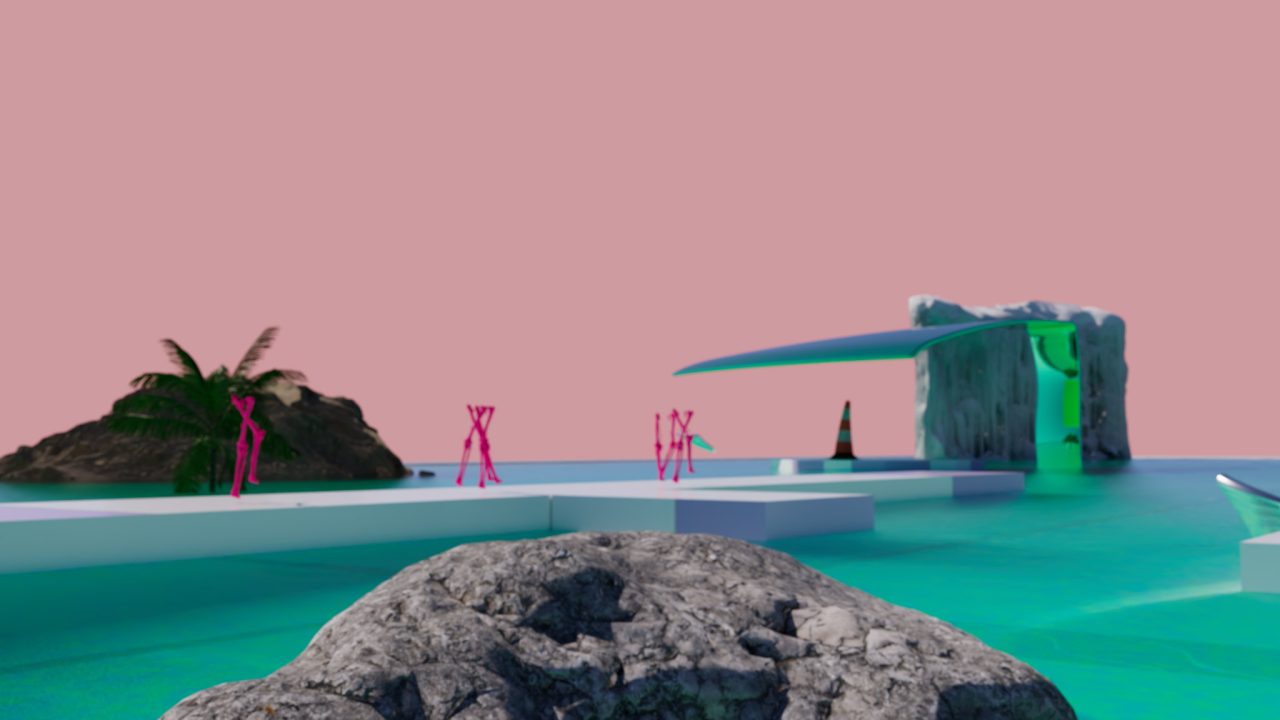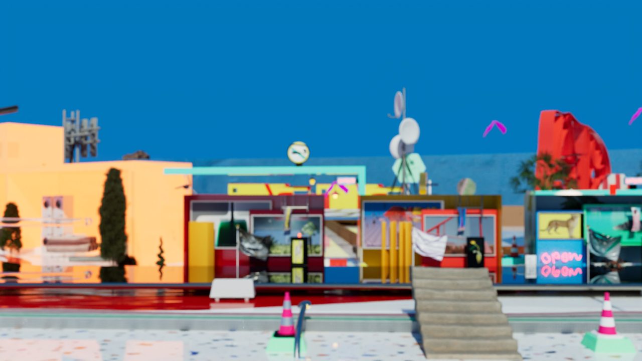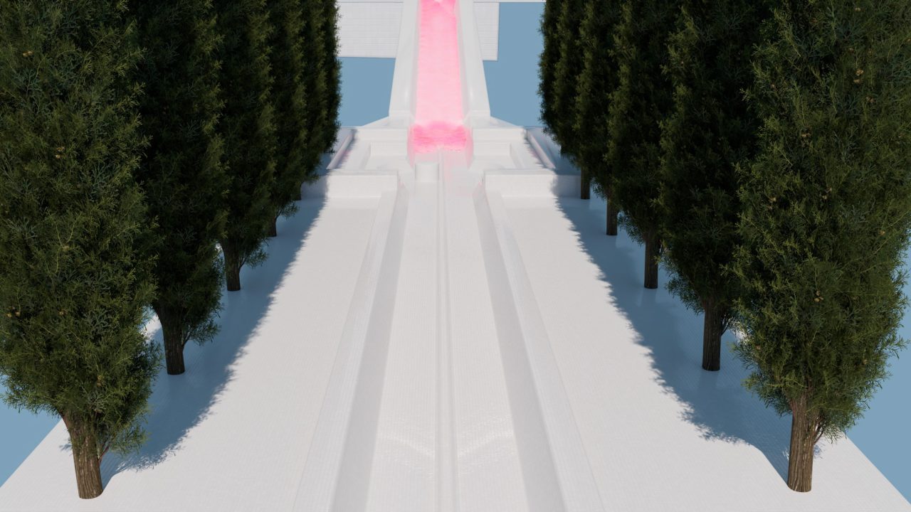 場所と場所が、時間と時間が、文字通り重なり合う。波の上にも、ヴェネチアの石畳の上にも、3DCG空間の座標系の中にも、同時にいる。この往復運動の中にいるとき、制作は充実する。この往還を観客にもひらくために必要なもの──それが「台」だ。台とは、対象の内部へと性急に越境せず、境界にとどまり、持続的に奥を観測するための足場である。何もない荒野では、どこに佇めばいいのかわからない。むしろ、明確な構造や(できれば装飾的でなく機能的な)形象があった方が、かえって頭も身体も自由に働き動く。他方で、ある様式や形式に基づいて設計された空間──庭園であれ建築であれ──には、設計者の意図が織り込まれていて、無作為な偶然が介入する余地はないように見えるが、しかしその構造があるからこそ、対象を凝視することと、そしてそこから逸れて連想を展開することが両立する。