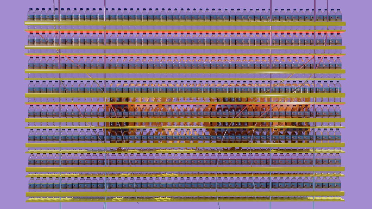 ミネラルウォーターの陳列棚。黄色い板の下にオレンジ色のLEDが取り付けられて、ジリジリと音を出している。探るように動く向こう側の文字。外壁塗装された表面。マス目、縁が盛り上がっていて、豪華に光輝く破片が隙間に滑り落ちないようになっている。あの怖い緑色の巨大な袋の向こうに黄色い柱を見る。フェンスにぐっと寄り、網目のひとつから、柱の素早い動きを捉えるのだ。黒いタイルの目地は少し汚れていて、四方から標識が倒れてくる。一番下になった標識の頭は、心地よく横たわる。