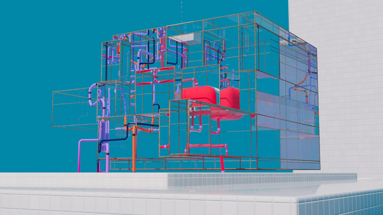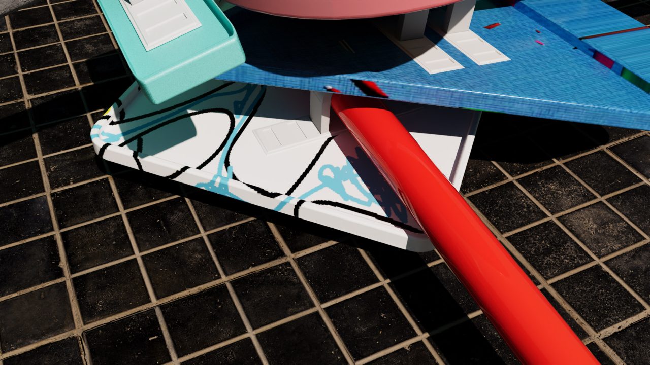 波打つ青タイルにタービンの影が落ちる。いつまでも眺めている通行人。太陽が黄色い平原の下に沈み始めるときに帰宅する。オレンジ色の巨大な壁に長い非常階段がついていて、上へ上へと自らを複製し、人が行ける範囲を垂直方向に増やしている。偉大な角があり、おそらく壁は閉じきっていなくて、上から抜け出せるだろう。ラムネ味の表面に金具とネジが埋め込まれたものは今はY字のかたちをとる。床、色褪せている。画鋲が硬いプレートに刺さる。農業用ネットを叩いて延ばして面にする。プラスチックが溶けて甘苦い。隅っこにある気持ち悪い網。到着する集団。水色の影が綺麗。エアコンが正常に送風する。