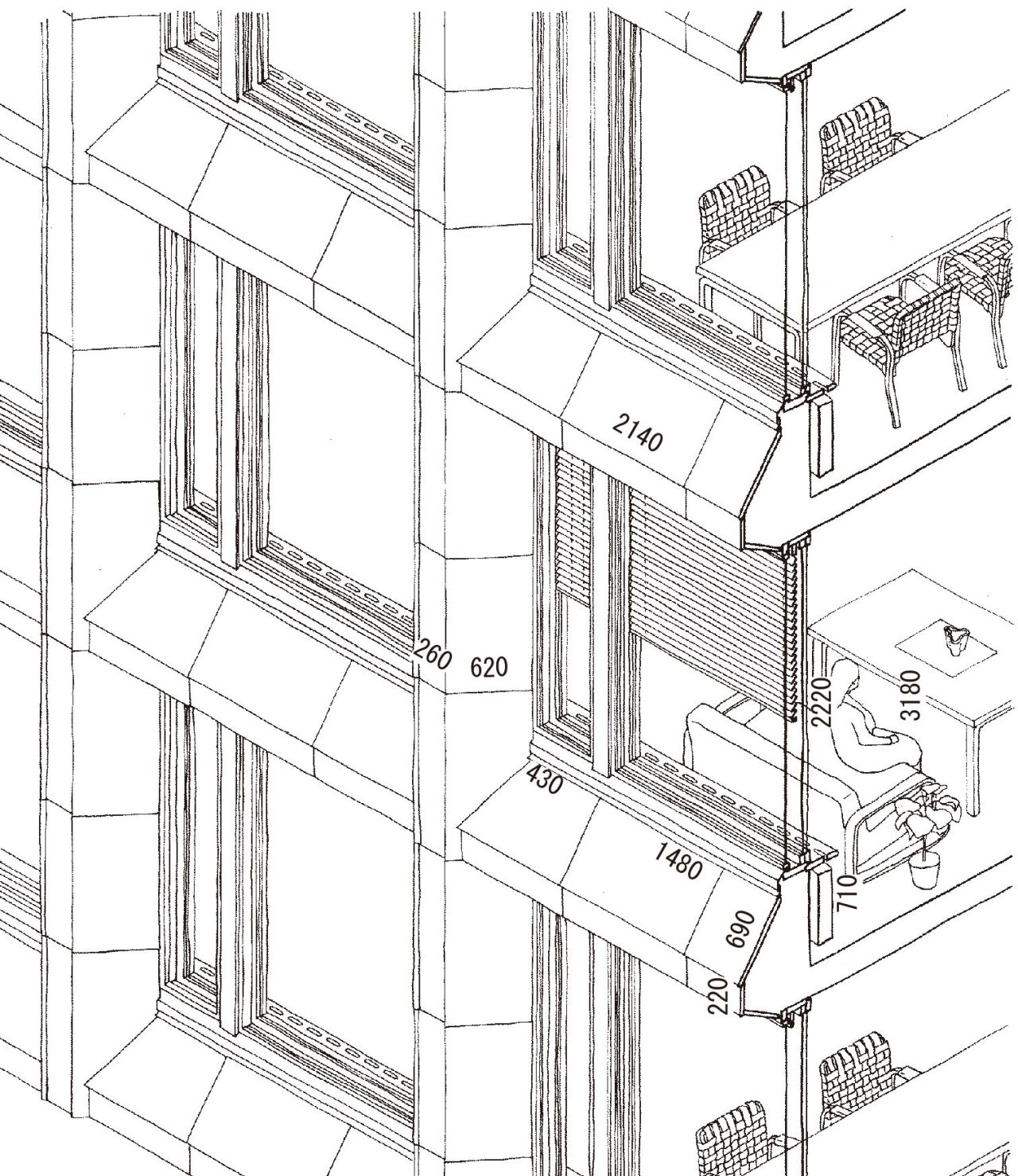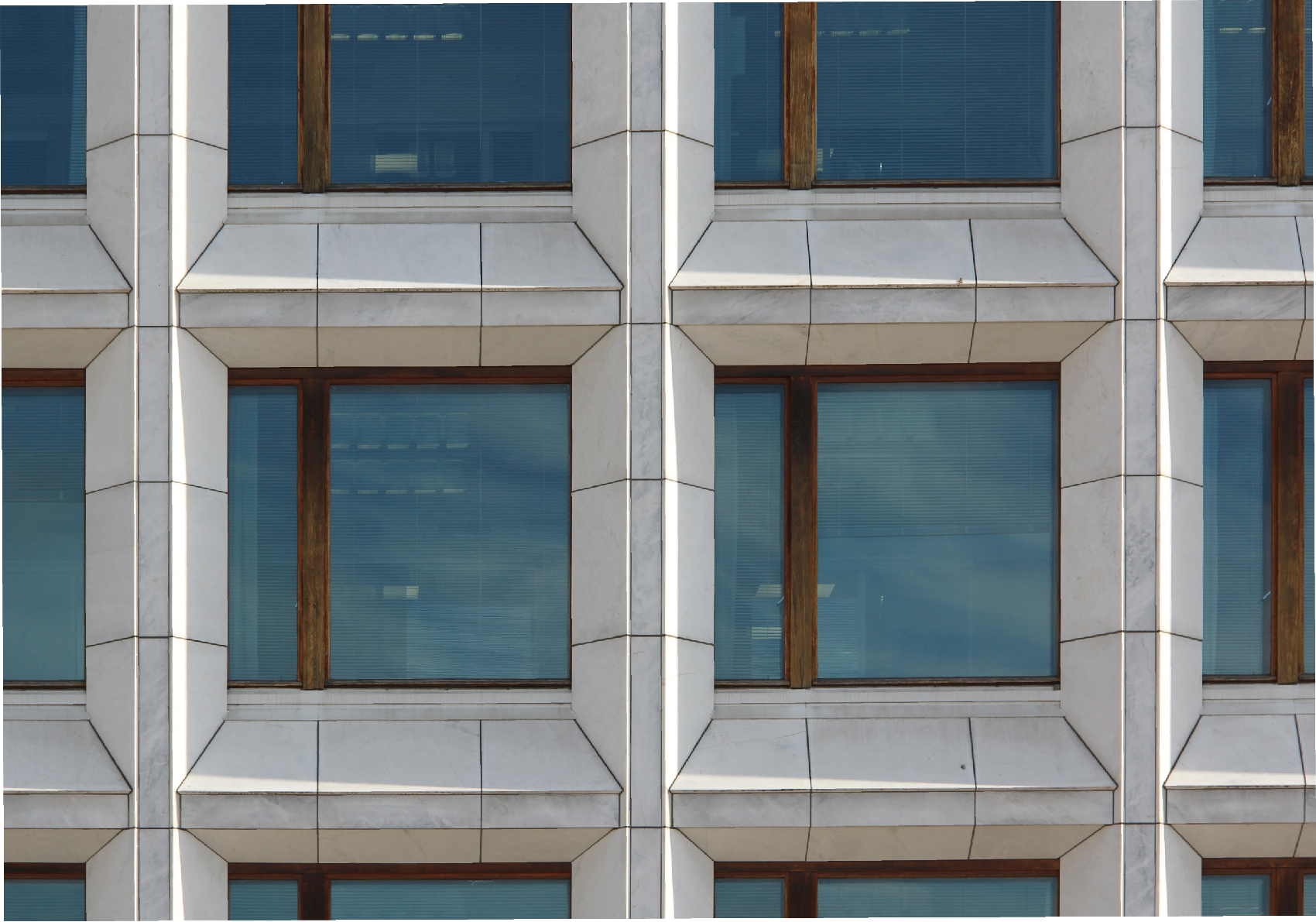 港に面しエスプラナーディ通りの軸上に位置するこの建物では、同通りに並ぶ新古典主義建築の白いコーニスに合わせ、カラーラ産の大理石で柱梁が覆われている。正方形の格子の内部にははめ殺し窓と換気用小窓が設けられている。外側は塩害に強いチーク、内側はチークとアカマツで窓枠がつくられている。大理石のパネルは、柱では左右均等に、梁では雨がかりになる上面によせて勾配がつけられている。