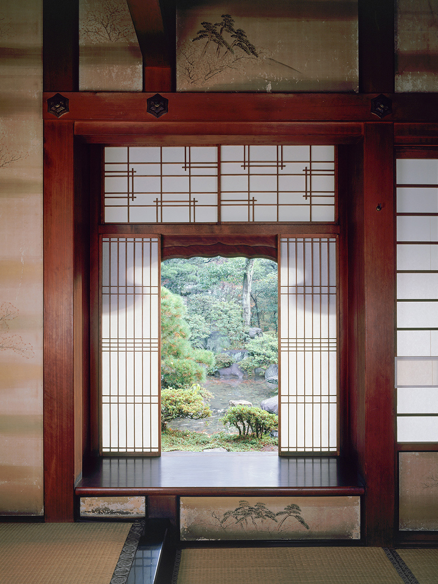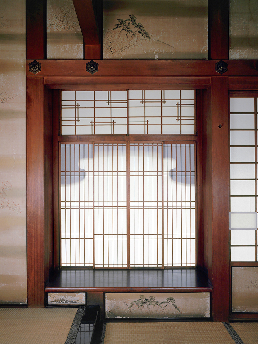 しょいんしょうじ(書院障子) しょいんしょうじ(書院障子) 書院造の座敷において、附書院または平書院に設けられる障子。附書院では出文机の上部に建て込み、平書院では床脇の開口部に設けられる。いずれも採光と外部との緩やかな遮断を担い、座敷飾りを構成する要素として用いられる。引違いを基本とし、規模や用途に応じて片引きや上げ下げとする場合もある。書院障子は、書院窓を構成する建具の一つであり、戸や欄間と組み合わせて用いられる。附書院においては出文机上部の開口に建て込まれ、書院窓の意匠と機能の一部を担う。 ⇨ 書院窓 京都御所 御涼所 上の間 書院 書院障子(閉)/写真:岡本茂男 京都御所 御涼所 上の間 書院 書院障子(開)/写真:岡本茂男 窓の用語集