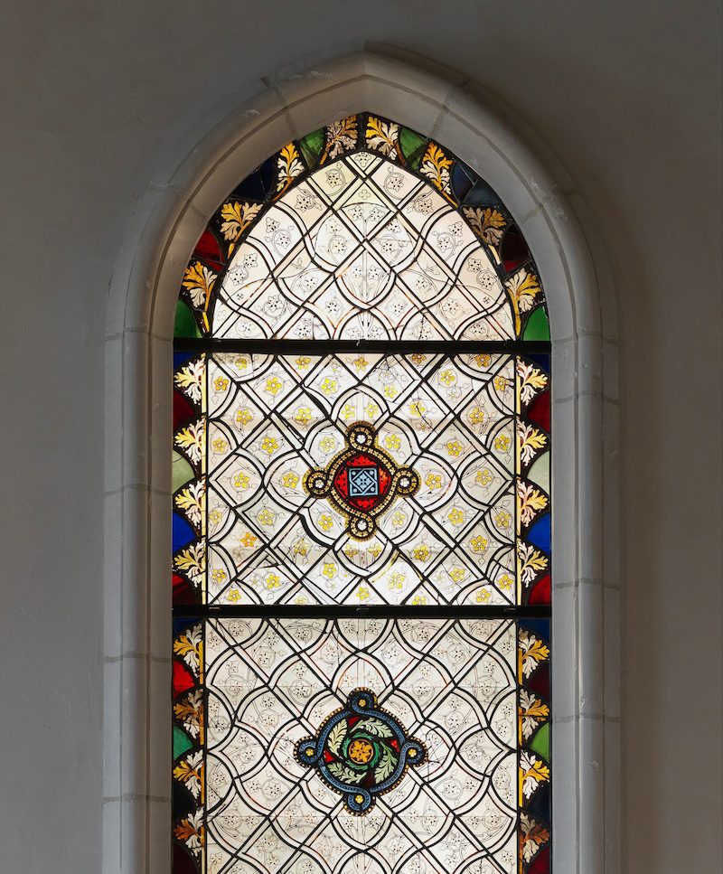 せんとうまど(尖頭窓) せんとうまど(尖頭窓) lancet window 上部が尖頭型(半径の等しい2つの円弧を組み合わせたアーチ)で、トレーサリーを持たない縦長のアーチ窓。主にゴシック建築の教会や大聖堂において、ステンドグラスと組み合わせて用いられた。「ランセット窓」とも呼ばれ、尖頭アーチが二連で並ぶ場合は「ダブルランセット窓(double lancet window)」と呼ばれる。 葉模様のグリザイユ・ステンドグラスを嵌めたランセット窓の上部(ca. 1320~1330、フランス・ノルマンディー地方ルーアン) The Cloisters Collection, 1984 窓の用語集